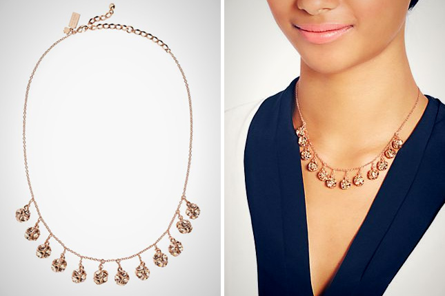 1. Lady Marmalade Mini Necklace : Just when you thought rose gold couldn’t look any more amazing, it pairs up with foil glass stones for maximum shimmer. This delicate chain would look stunning against a navy boatneck blouse.